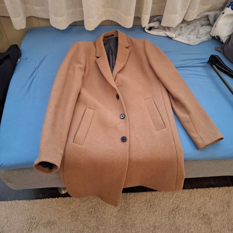Scandinavian Edition ullkåpe for herre i størrelse L. Kåpen er brun og laget i ullmateriale. Modellen har høy krage, knappelukking i front og to skrålommer. Passer som ytterplagg i kjøligere vær og til både hverdags- og penere bruk.