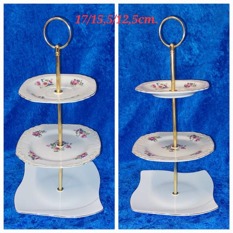Etasjefat stemplet Avon Cottage, Wedgwood & Co LTD, founded in 1835 by Enoch Wedgwood. Vakkert i hvitt og blått, og blankt og fint. Har dessverre et nagg på nederste fat på kanten under, men lite synlig sett ovenfra. Se bilder. Etasjefatet er totalt ca 25cm høyt, nederste fat har en diameter på ca 23-24cm og det øverste ca 17-18cm.