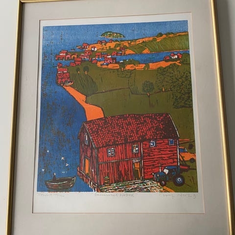 Str. B 65, H 85 Innrammet bilde med fargerikt landskapsmotiv. Bildet viser et stilisert landskap med hus, mennesker og natur i sterke farger mot mørk blå bakgrunn. Det er montert med passepartout og rammet inn i en rektangulær ramme med gullfarget kant. Egnet som veggdekor i stue, gang eller andre oppholdsrom.