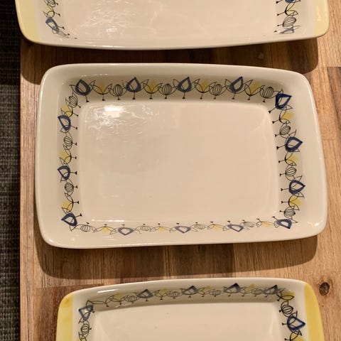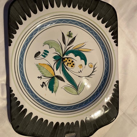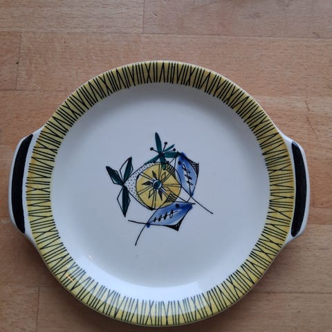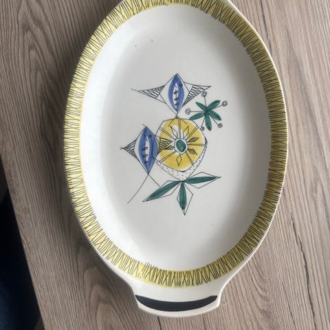 Dette er en ildfast tallerken eller serveringsfat fra Stavangerflint i serien "Bambus" med dekor "Flamingo", designet av Inger Waage på 1950- eller 1960-tallet.