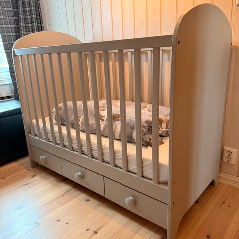 IKEA sprinkelseng i grå farge. Sengen har klassiske sprosser på langsidene og hel gavl i begge ender. Under sengen er det tre uttrekksskuffer som gir ekstra oppbevaringsplass til for eksempel sengetøy eller leker. Madrass følger med etter avtale dersom ønskelig.