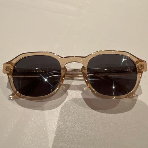 A Kjærbede solbriller unisex. Klassiske solbriller med mørke glass og innfatning i metall og plast. Leveres med etuiet som vises på bildene. Passer til både menn og kvinner.