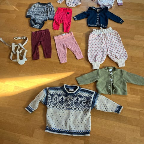 Jeg legger ut klær og utstyr etter hvert som ungene vokser ut av de. Bare å ta kontakt om du ønsker å kjøpe flere ting; jeg kan sende det samlet.