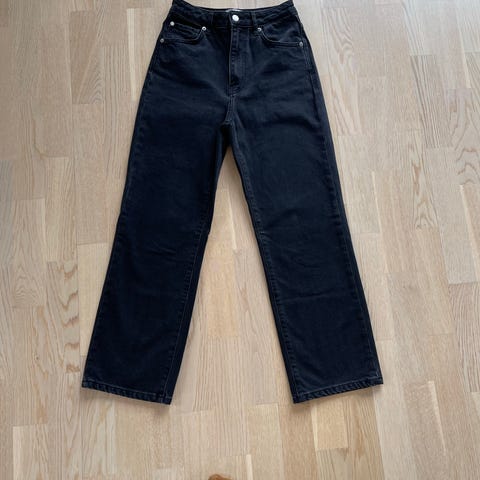 Buksa er laget i bomull og har klassisk femlommersdesign med glidelås og knapp i front. Modellen har beltehemper i livet og baklommer. Størrelse 38 med livvidde W28.