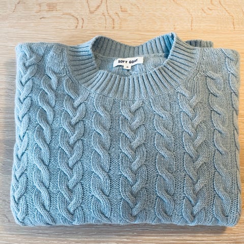 Soft Goat genser for dame i størrelse S. Den har ribbestrikket struktur og v-hals med bred ribbekant. Brukt 2 ganger og er som ny