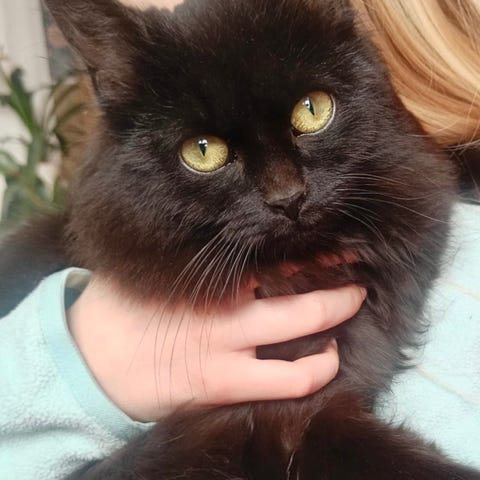 Hun er en sort blandingskatt som har vokst opp inne sammen med sine 3 søsken og sin mamma.