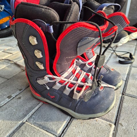 Snowboardstøvler i størrelse EU 38 (Mondo 24.0). Støvlene har snøring foran og forsterkninger i tå- og hælparti. Fargekombinasjon i gråtoner med mørke detaljer. Egnet til bruk med snowboardbindinger som passer til denne typen myke snowboardstøvler. Passer til ungdom eller voksne som bruker skostørrelse rundt 38.