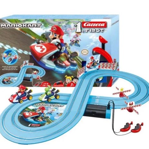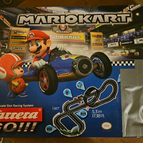Super Mario Mario Kart Carrera GO bilbane. Settet inneholder racerbane med flere deler som kan settes sammen til ulike banekonfigurasjoner, samt to biler med figurene Mario og Luigi i gokarter. Bilbanen drives med elektriske biler som styres med håndkontrollere. Egnet som lekesett for barn som liker Super Mario og bilbanelek.
