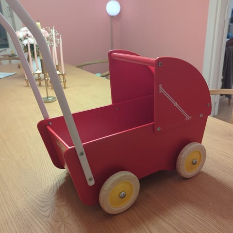 Vogn med madrass, pute og dyne. Kanin med sovepose.