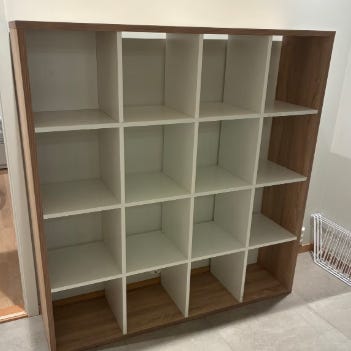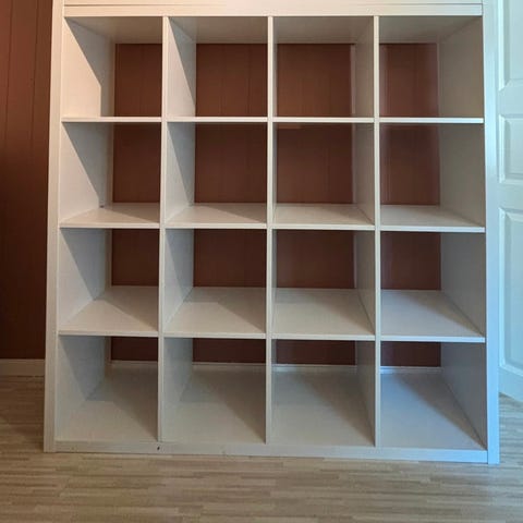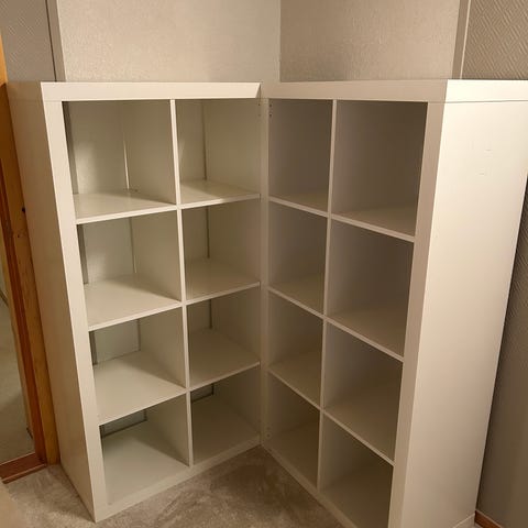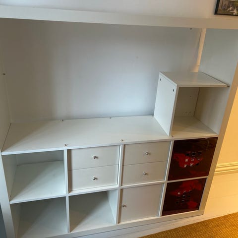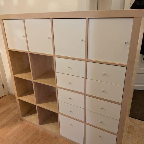 IKEA Kallax hylle/romdeler str 184x184 cm. Godt brukt, en liten skade på hyllen bak (se bilde) men kan ikke sees når den står inntil vegg. Ellers i god stand. Hyllen er demontert og klar til henting helst i dag!