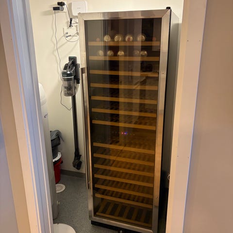 Frittstående med kapasitet på +/- 33 flasker innredet med trådhyller.