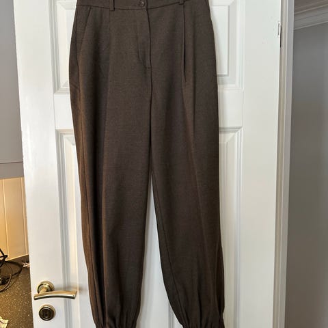 Vide bukser i bomull, kraftig jeansliknende stoff. Buksene er pent brukt og har ingen flekker eller skader. De er lagt opp til å passe en person på 165 cm. Brettekanten kan enkelt legges ned igjen.