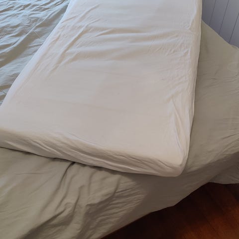 Overmadrass kjøpt på Jysk for et par år siden, men jeg kjøpte feil størrelse, så den har aldri blitt brukt på en seng, bare ligget rundt omkring under senger og i skap og sporadisk slengt ut som turnmatte for unger. Er litt nuppete og slikt, men ser helt fin ut.