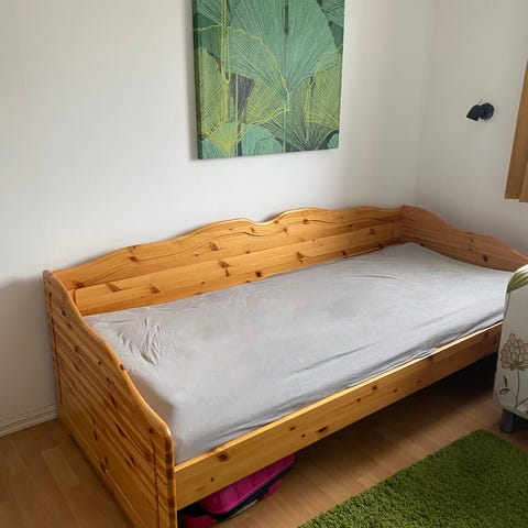 Selger enkel sengeramme i massivt furu, passer madrass 90×200 cm. Senga er solid bygget med trelameller og midtstøtte, fin naturlig furufinish med synlige treknuter — gir en varm, nordisk stil.