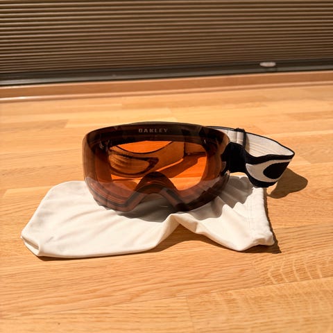 Oakley skibrille i hvit farge med oransje linse. Brillen har justerbar stropp med Oakley-logo og leveres med oppbevaringspose. Egnet til bruk ved ski- og snowboardaktiviteter/alpint. Voksen størrelse.