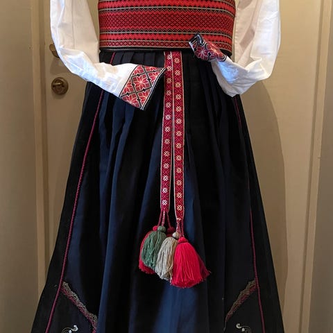 Beltestakk (ny) med liv i silke, bånd på forkle, brikkevevd belte og brodert skjorte.