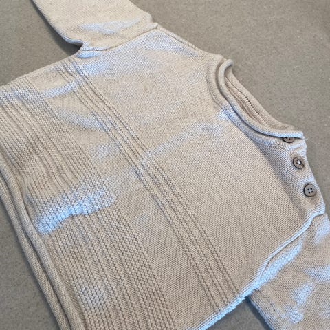 Cubus ullsett for barn, bestående av genser og bukse i størrelse 86. Sett i beige merinoull, egnet for unisex. Genseren har lange ermer, rund hals og knapper på skulderen for enklere av- og påkledning. Buksen har lange ben og ribbekanter nederst. Materialet er merinoull, som er mykt og tynt, og kan brukes som innerlag eller mellomlag. Fargen er nøytral beige som passer til både jenter og gutter i ca. størrelse 86.