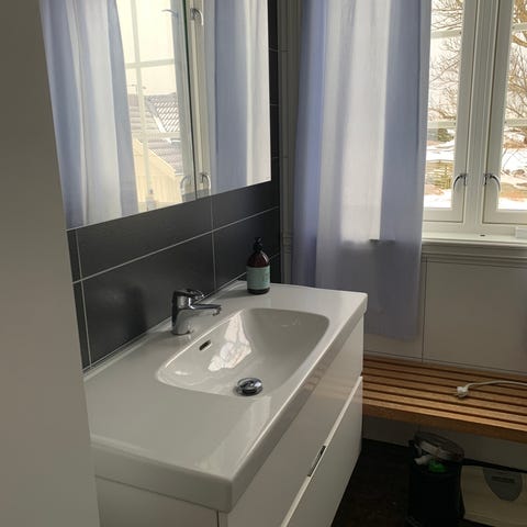 Baderomsinnredning bestående av servantskap med hvit servant og tilhørende speilskap.