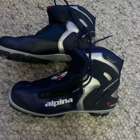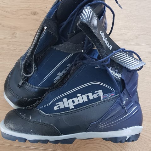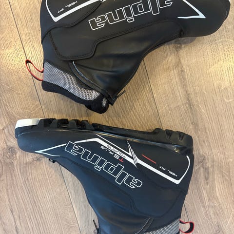 Alpina BC80 fjellskistøvler i størrelse 41. Støvlene er i svart med lyse detaljer og har kraftig yttersåle til bruk med fjellski/bredere langrennsski. Overdelen er i syntetisk materiale med tekstilfôr på innsiden. Modellen er laget for stabilitet og støtte rundt ankelen ved turer i variert terreng. Passer til bruk med kompatibelt fjellskibindingssystem i BC-kategorien.