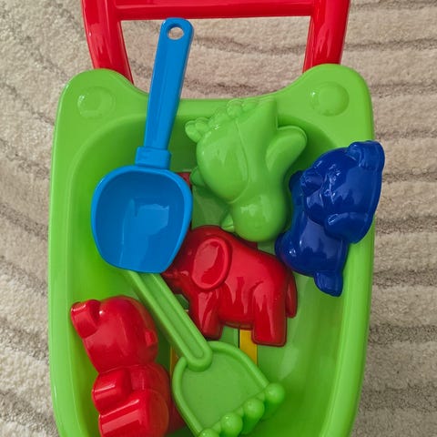 Fargerik og solid trillebår for barn selges. Perfekt til lek ute i hagen eller sandkassen.