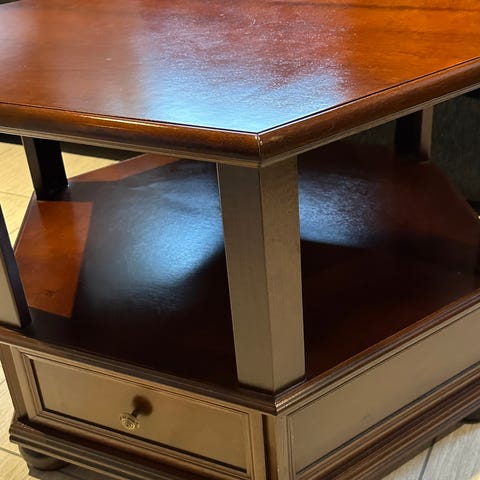 Kjempefint konsollbord/ avlastningsbord i mørkbeiset tre og jern understell selges billig pga plassmangel. Beisen er litt skrapt av noen steder uten at dette har noe særlig betydning og kan enkelt fikses hvis man har mørk beis.