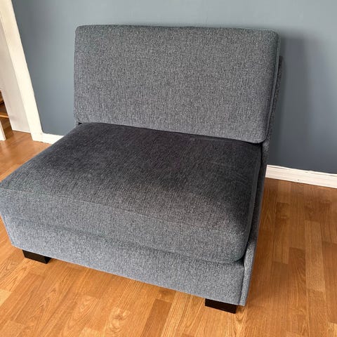 Gir bort en grå, polstret lenestol. Den har stått på lekerom, så det er synlige flekker på sitteputen (se bilder). Stoffet er ellers helt og fint, og stolen er stabil og god å sitte i.