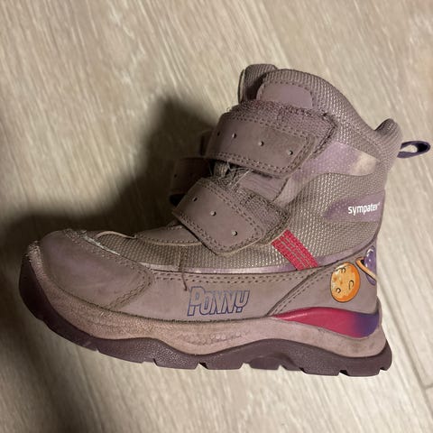 Vintersko fra Ponny til jente i størrelse 24. Godt brukt av ett barn i 1 sesong. Mye bruk igjen, ingen skader som har noe å si for bruken. Kan impregneres på nytt før salg hvis ønskelig.