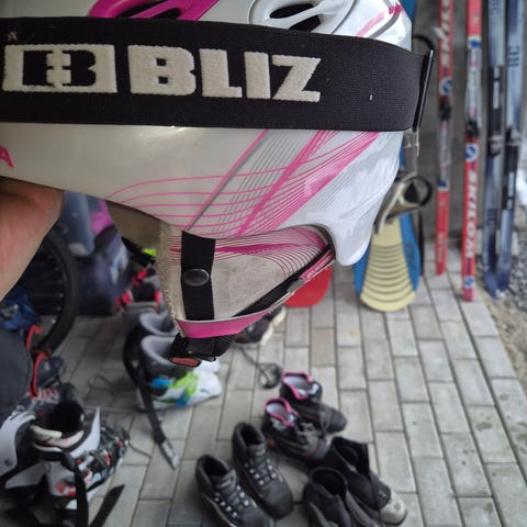 Bliz skibriller med elastisk svart stropp med hvit logo. Rammen fremstår hovedsakelig i lyse farger, tilpasset bruk sammen med hjelm. Egnet til alpint og annen vintersport der det er behov for øyebeskyttelse mot vind og snø.