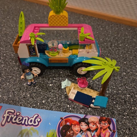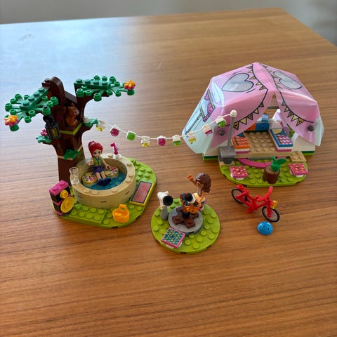 LEGO Friends lekesett camping og spa. Settet består av en rosa telt-/campingscene med innredning, sykkel og uteområde, samt et tre med lite spa/boblebad, kanin og tilbehør. Inneholder flere minidukker/figurer, dyr og små byggeelementer som bålplass, bord, lykt og dekorasjoner. Passer til lek med camping-, natur- og vennskapstema.