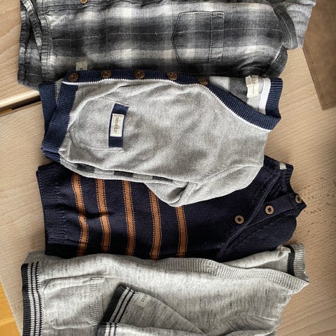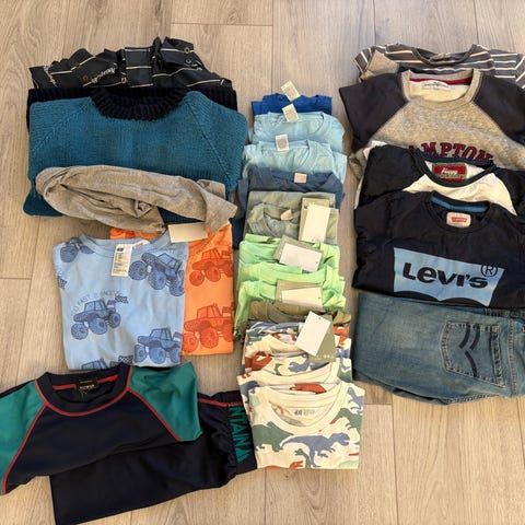 Joha og Name it, gutteklær i størrelse 134 og 146 i flerfargede nyanser. Pakken inneholder ulike overdeler og en underdel i myke ull tekstiler. Fargene varierer mellom blåtoner, grått, beige og stripete mønster. Klærne passer til barn rundt størrelse 134 - 146.