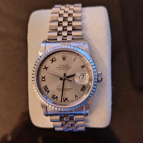 Meget nydelig og godt ivaretatt Rolex Datejust med en hnydelig Pearl of mother skive som passer utmerket klokken. Dette er en sjeldent rolex datejust fra 1950 som er i meget stand både teknisk og kosmetisk. Stram og fin lenke. Klokken har nylig fått full service med overhaling sent 2024. Der ble det gjort service, takstpapir, bytte til safirglass (plexi følger med). Service kostet 16.500kr så her får du en klokke i tipp topp stand!