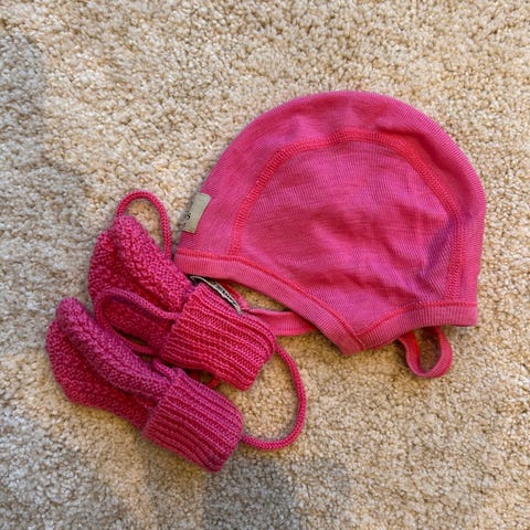 Janus lue i ull til jente i rosa farge. Str. 53/55. Lua er i 100 % ull, med ribbestrikka kant og strukturstrikka felt over. Grøn blome som detalj.