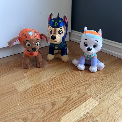 Paw Patrol kosedyr sett. Inneholder flere figurer fra Paw Patrol-serien i myk plysj. Egnet som leker eller kosedyr for barn som liker Paw Patrol-universet.