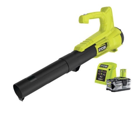 Ryobi Whisper Series løvblåser. Batteridrevet løvblåser med kompakt og håndholdt design. Egnet til rydding av løv, gress og annet lett hageavfall fra gårdsplass, terrasse og hageområder. Modellen har et rett blåserør for konsentrert luftstrøm og er del av Ryobi-systemet for hagemaskiner med utskiftbare batterier.