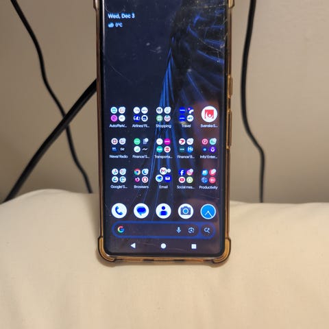 Mobilen ble åpnet og prøvd i en uke, men jeg klarte ikke bli venner med den, så den har stort sett blitt liggende på bordet. Satte på deksel og skjermbeskytter så fort jeg fikk den, den er derfor helt ripefri og fin.