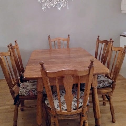 Til salgs: et vakkert spisebord og stoler.