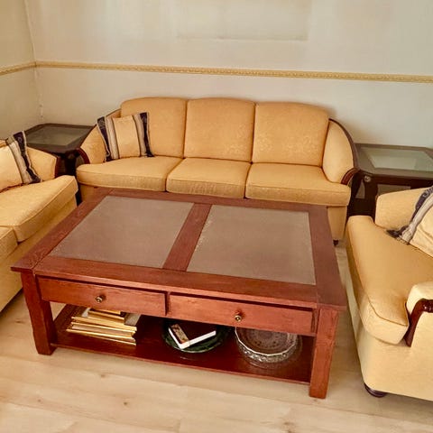 Sofa, bredde155 cm høyde rygg 90 cm,høyde ifra gulv og setehøyde 47 cm...Bord ..bredde 110 cm høyde ifra gulv 75 cm...Stoler..bredde pute 44 cm og setehøyde 47 cm...Bud og selges samlet