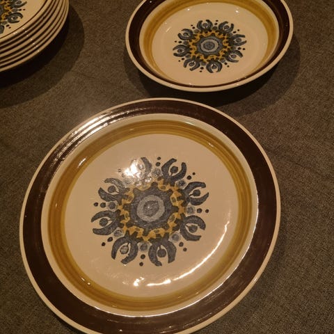 11 asjetter, 5 tallerkner, 3 skåler og 4 små asjetter. Noen er godt brukt. Andre er ikke så synlig brukt. Kan selger deler av servise da må vi bli enig om pris.