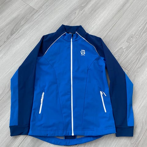 Dæhlie juniorjakke i str. 140. Blå med turkise ermer og hvite glidelåser. Hel glidelås og to lommer med glidelås. Høy krage. Egner seg til langrenn, trening og hverdagsbruk i overgangsvær.