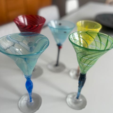 Fire Kari Ulleberg vinglass - alle litt forskjellige i klokke eller stett. To røde, et grønt og et sort.