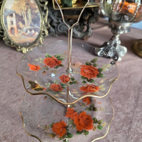 2-etasjes kakefat/stettfat i porselen fra Christineholm Porcelain ("Rose").