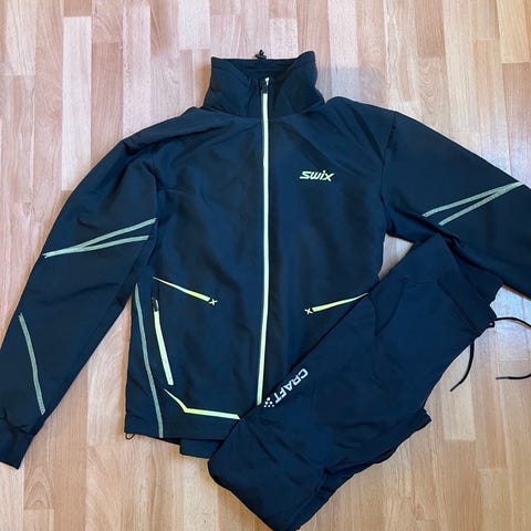 Swix treningsdress for herre i størrelse M, jakke størrelse S. Sett med jakke og bukse i svart med kontrastdetaljer. Jakken har hel glidelås foran, høy krage og glidelåslommer i siden. Buksen har smal passform, glidelås nederst på bena og glidelåslommer. Egnet som trenings- eller fritidsdress i kjøligere vær.