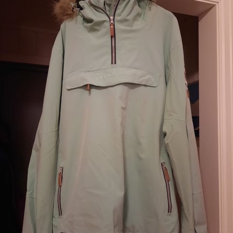 Twentyfour yttertøy jakke i turkis farge, størrelse 40, dame. Laget av 94% polyester og 6% spandex materiale. Jakken har hette med avtagbar pelskant og glidelåslommer.