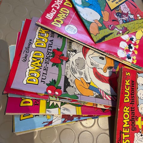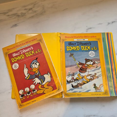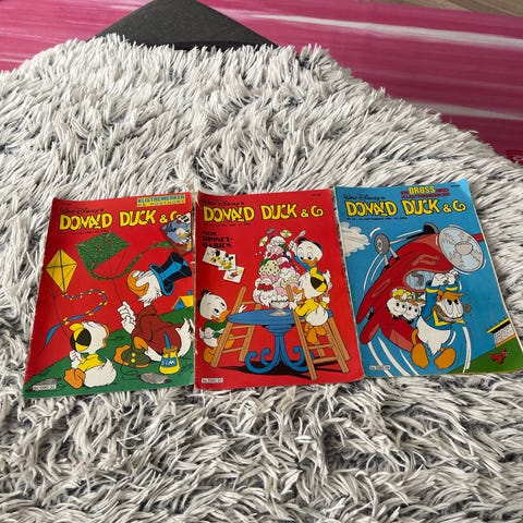 Walt Disney Donald Duck & Co tegneserieblader. Samling med flere hefter med fargeomslag og klassiske Disney-figurer som Donald Duck, Ole, Dole og Doffen, Mikke Mus, Langbein og Chip og Chap på forsiden. Hegftene er i magasinformat og egner seg for lesing eller som samlerobjekter for tegneserieinteresserte. Fra 1972 til 1986 bud
