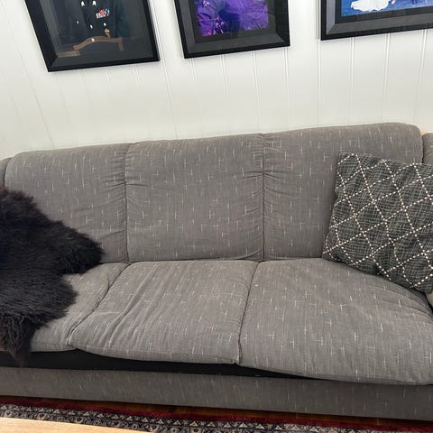 Kirsebærtre, kan demonteres, pute kan vaskes og renses. Høyde 90cm, bredde 75, dybde 50