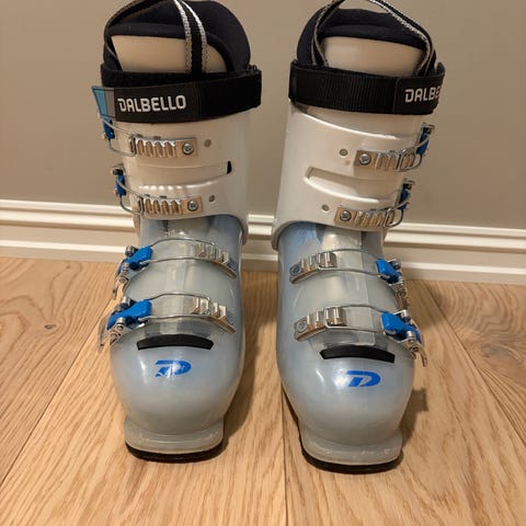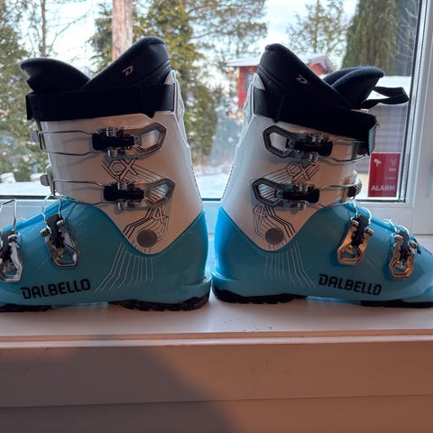 Dalbello alpinstøvler i størrelse 22.5. Støvlene har hvit og blå ytterskall med flere justerbare spenner i metall og øvre borrelåsreim for bedre tilpasning rundt leggen. Undersålen har utskiftbare såledeler med gripefelter. Lite brukt.