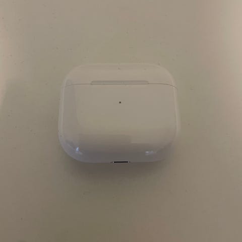 Apple AirPods ladeetui i hvit farge. Etuiet er beregnet for trådløse ørepropper av typen AirPods 3.gen og brukes til oppbevaring og lading av øreproppene. Passer til bruk sammen med kompatible Apple-enheter som iPhone, iPad og Mac via Bluetooth-tilkobling.