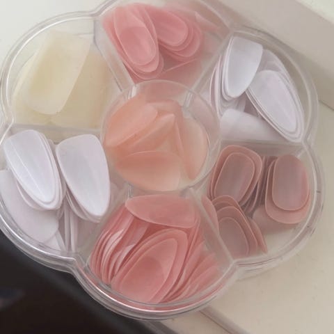 Falske negler sett i plast med blandede farger. Neglene leveres i sorterte rom i oppbevaringsbokser, med både nøytrale, mørke og sterke fargetoner. Lengden på neglene er vist med målebånd på bildet for omtrentlig størrelse. Egnet til negledesign og manikyr der man ønsker å lime på ferdig formede negler og eventuelt dekorere videre med lakk eller annet tilbehør.