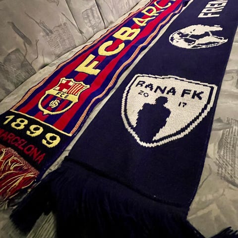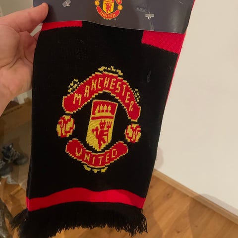 Manchester United skjerf i svart, rødt gult og hvitt med klubbens logo i begge ender og teksten «Manchester United» langs midten. Skjerfet har frynser i endene. Selges Kr. 100.