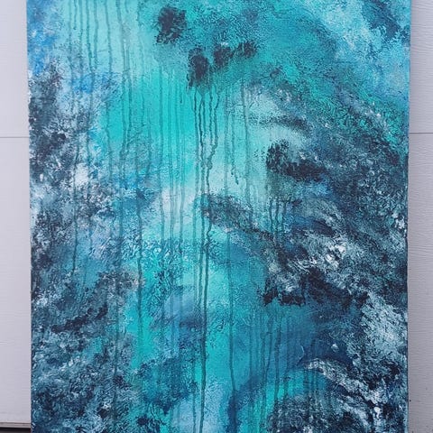 Selger et unikt, håndmalt abstrakt maleri i varme jordfarger med spennende struktur og dybde. Kombinasjonen av rust, oker, grønt og mørke nyanser gir bildet et eksklusivt og stemningsfullt uttrykk.